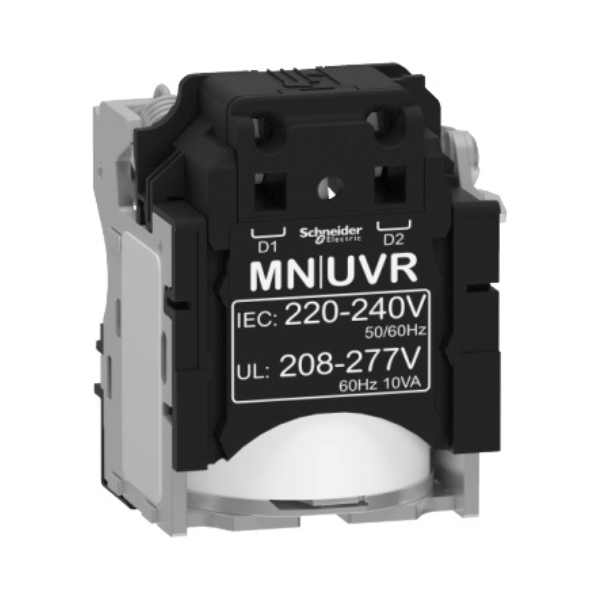 کلید اتوماتیک در دو نوع کلید قابل تنظیم و غیر قابل تنظیم (فیکس) تولید میشود و برند اشنایدر نیز یکی از مطرحترین برندهای تولیدکننده انواع کلید اتوماتیک یا MCCB میباشد. کلید اتوماتیک اشنایدر نیز در انواع قابل تنظیم و ثابت و در رنجهای مختلف جریان و انواع واحدهای تریپ و حفاظت تولید و عرضه میشود. رله آندر ولتاژ 220-240 ولت کلید اتوماتیک اشنایدر یکی از لوازم جانبی کلید اتوماتیک اشنایدر است که کار آن قطع کلید و اینترلاک است. این رله از نوع رله آندر ولتاژ است و رنج ولتاژ آن 220-240 ولت AC میباشد. این رله با کلیدهای اتوماتیک سری NSX100 تا NSX630 سازگار است.